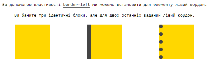 border-left- це універсальна властивість для скороченого запису значень для border-left-color, border-left-style й border-left-width. Ці властивості використовуються для стилізації лівої межі елементів.