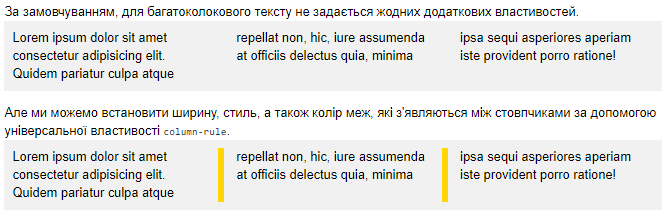 Властивість column-rule в багатоколонкові тексті малює лінію між колонками і визначає її параметри.