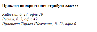 Текст в елементі <address> зазвичай відображається курсивом. Більшість браузерів додають розрив рядка до і після цього елемента. Якщо ця особливість не потрібна, використовуйте стилі для зміни шрифту, за це відповідає CSS властивість display.